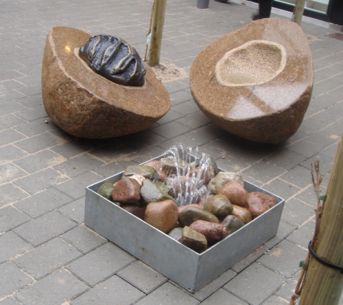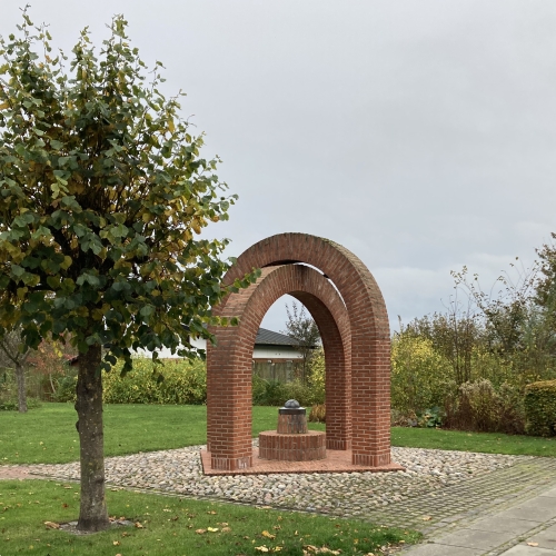 | Håndværkerkunst ved Frejaparken Placering: Frejaparken Kunstner: Murerne Hans Nielsen og Thorkild Hansen og arbejdsmand Ove Sørensen. Vandkunsten blev opført i 1989, da anden etape af Frejaparken stod færdig. Finansieringen blev givet af Arbejdernes Kunstfond og flere sponsorer. Den synlige skulptur er bygget op i et firkantet bassin, hvorover der rejser sig to murstensbuer, der krydser hinanden. Under disse buer er i to trin opbygget en rund murfigur, hvorover der er placeret en kobberkuppel. Bunden i bassinet består af fliser i forskellige farver. Når vandkunsten er i drift, risler vandet frem fra dyser i bassinets bund. Om aftenen er det hele oplyst af en belysning, der kommer fra buernes inderside. Alt er præget af smukt og solidt håndværk. |