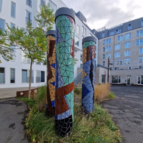 | Søjler fra Symfonien Placering: Kjellerupgade, Aalborg Kunstner er Ulla Helga Iversen I gården ved ungdomsboligerne i Kjellerupsgade står tre søjler. Søjlerne stod oprindeligt på facaden i Kjellerupgade, hvor de bød gæster velkommen til 'Symfonien'. Bygningen i Kjellerupsgade er præmieret i 1960, hvor den håndværksmæssige kvalitet er fremhævet, og igen i 1982, hvor den blev bygget om fra biograf til brug for Aalborg Symfoniorkester. I 2014 begyndte renoveringen af Symfonien, som i dag huser 100 ungdomsboliger og Vivaboligs administration. |