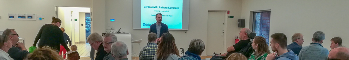 Først havde vi besøg af Zacharias Brix Madsen, der er Grøn Agent i Aalborg Kommune. Zacharias lagde de hårde facts på bordet i forhold til, hvorfor en aktiv handling mod en bæredygtig udvikling er nødvendig. Han forklarede bl.a., at vi på verdensplan forbruger det, der svarer til 1,7 jordkloders ressourcer, og at vi i Danmark allerede har opbrugt vores årlige ressourcer d. 28. marts. Derfor er der alt mulig grund til, at vi også i Danmark ændrer vores måde at leve og forbruge på. Zacharias gjorde det samtidig klart, at Aalborg Kommune er indstillet på at gøre en stor indsats for at blive en bæredygtig kommune, og at de i partnerskab med os, vil arbejde sig hen mod det mål.