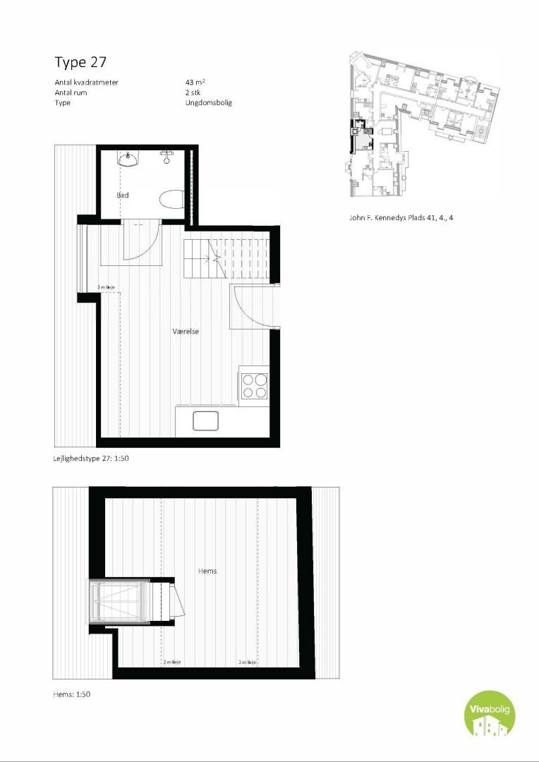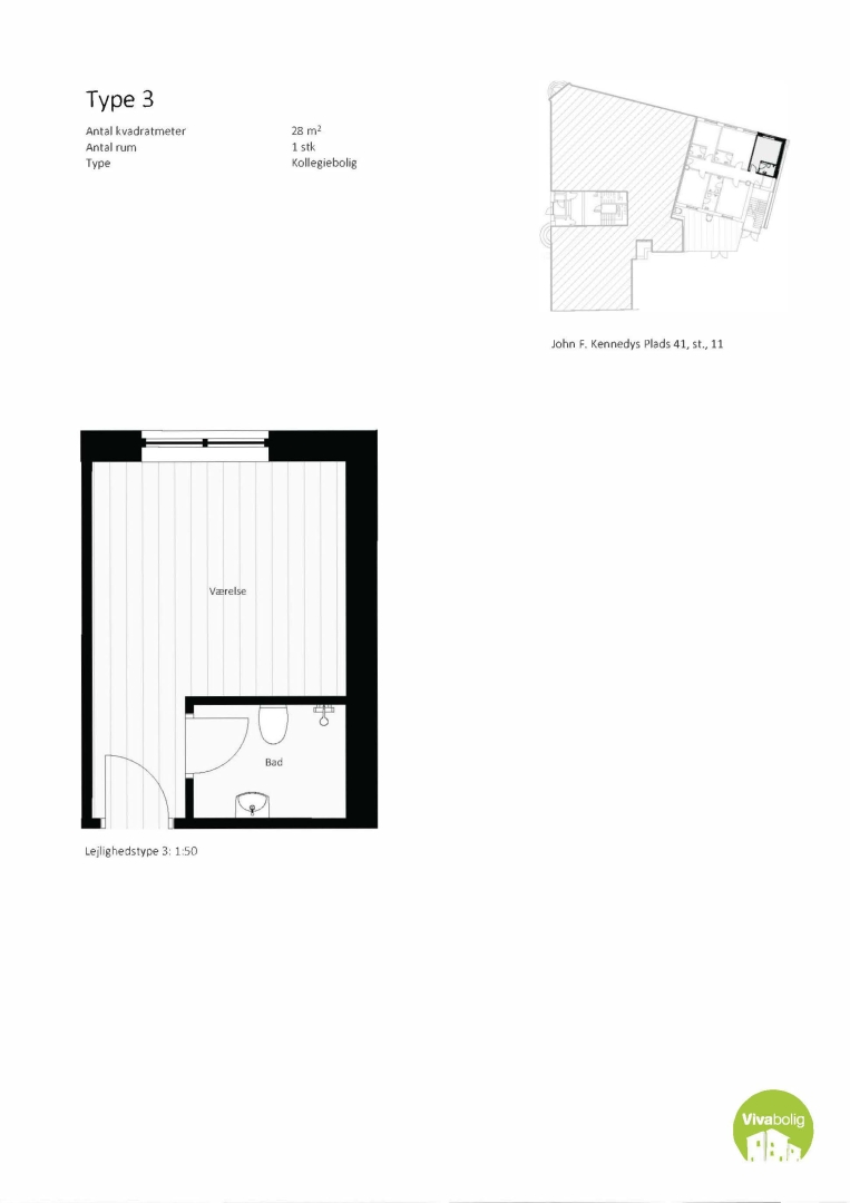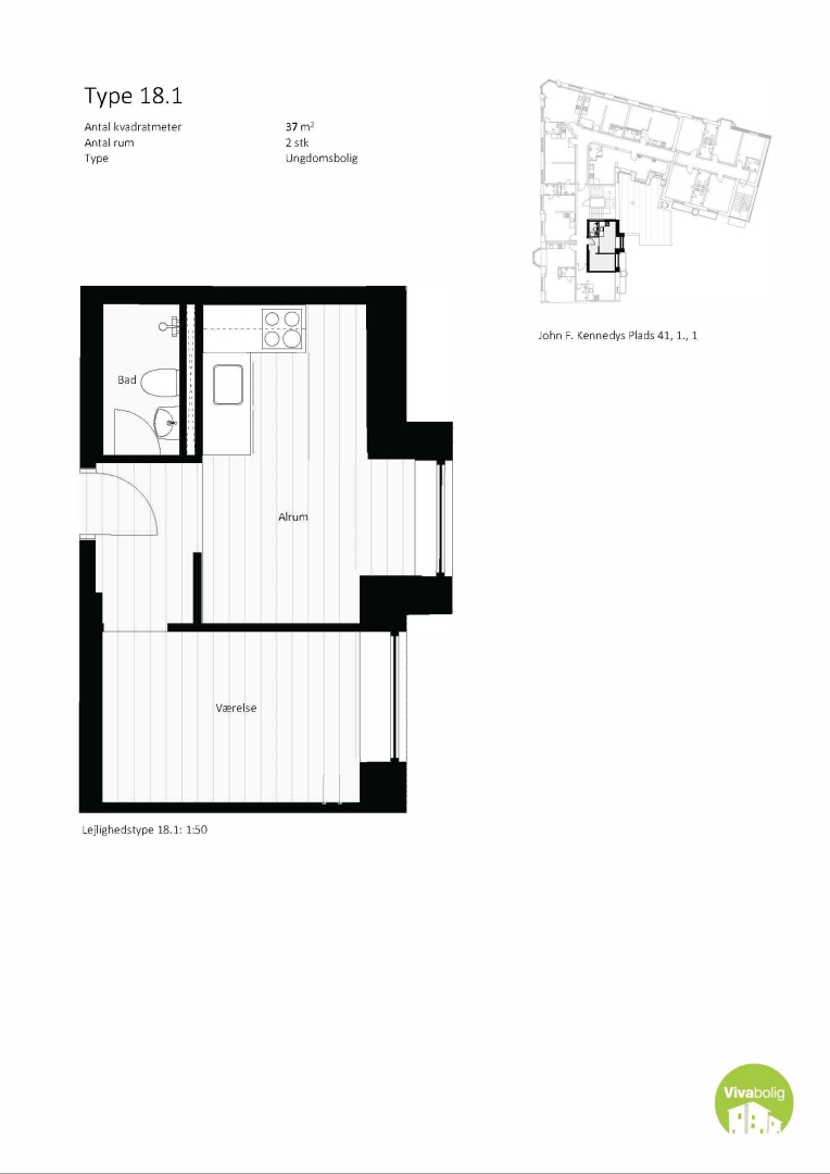 | ADRESSE: John F. Kennedys Plads 41, 2. 18 | RUM: 1 | M2: 28 | INDSKUD: 5.250 | HUSLEJE: 1.807 | BOLIGTYPE: Etagebyggeri | LEJEMÅLSTYPE: Kollegieværelse | FORBRUG: 450 | ELEVATOR: ja | HUSDYR: nej | |