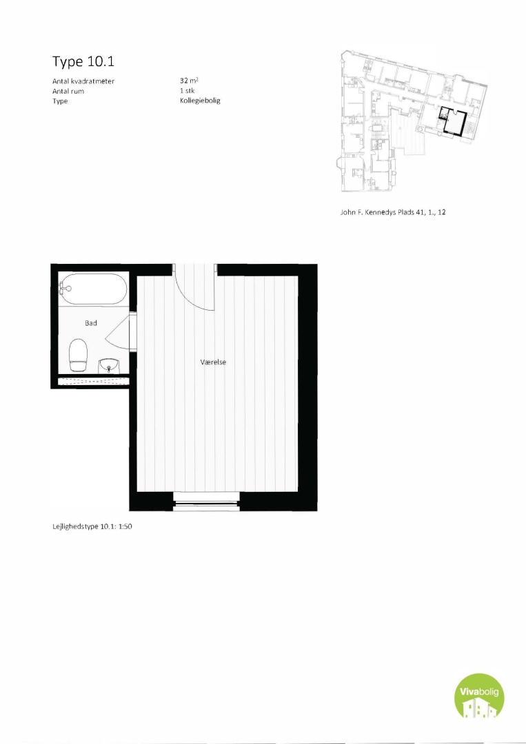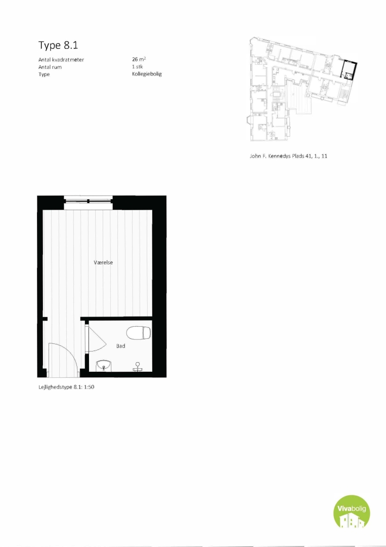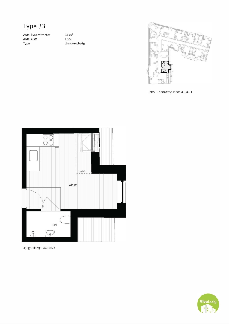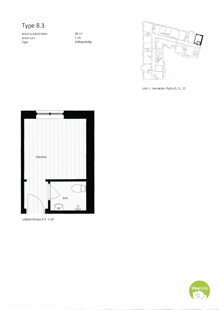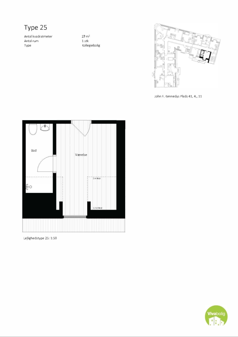 | ADRESSE: John F. Kennedys Plads 41, 1. 11 | RUM: 1 | M2: 26 | INDSKUD: 4.950 | HUSLEJE: 1.704 | BOLIGTYPE: Etagebyggeri | LEJEMÅLSTYPE: Kollegieværelse | FORBRUG: 450 | ELEVATOR: ja | HUSDYR: nej | |