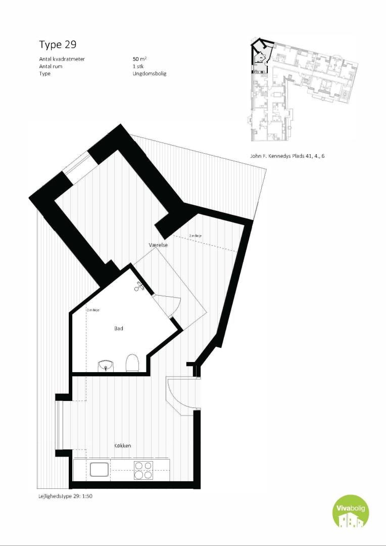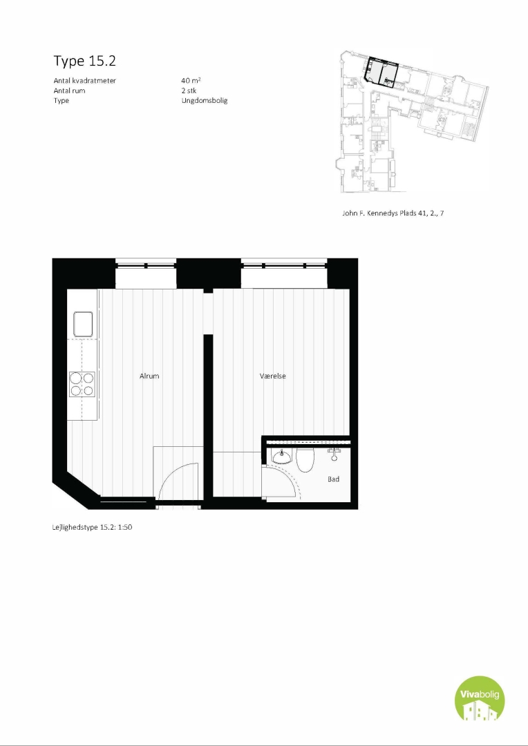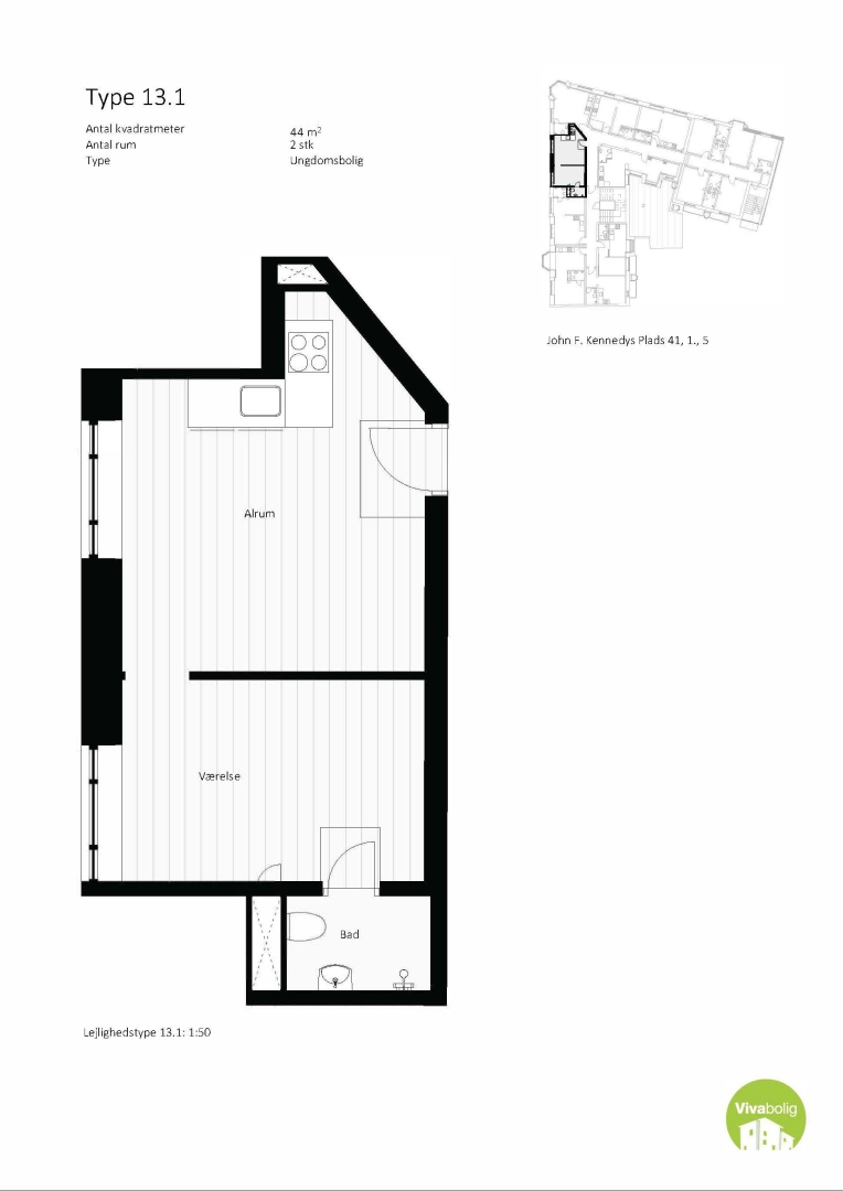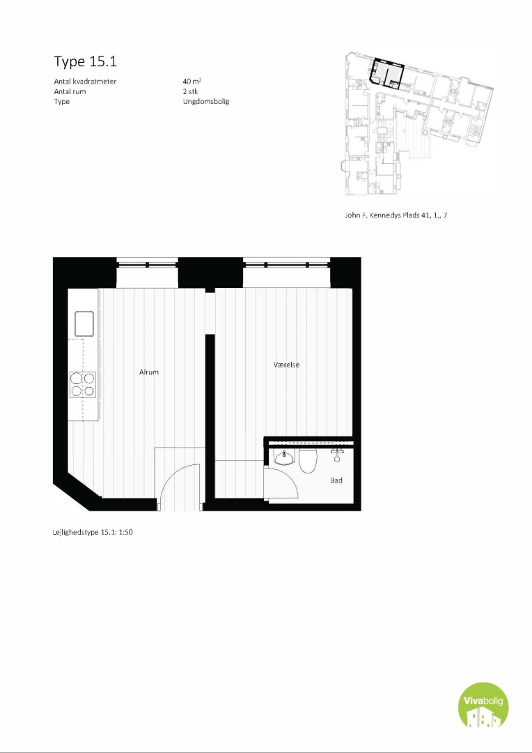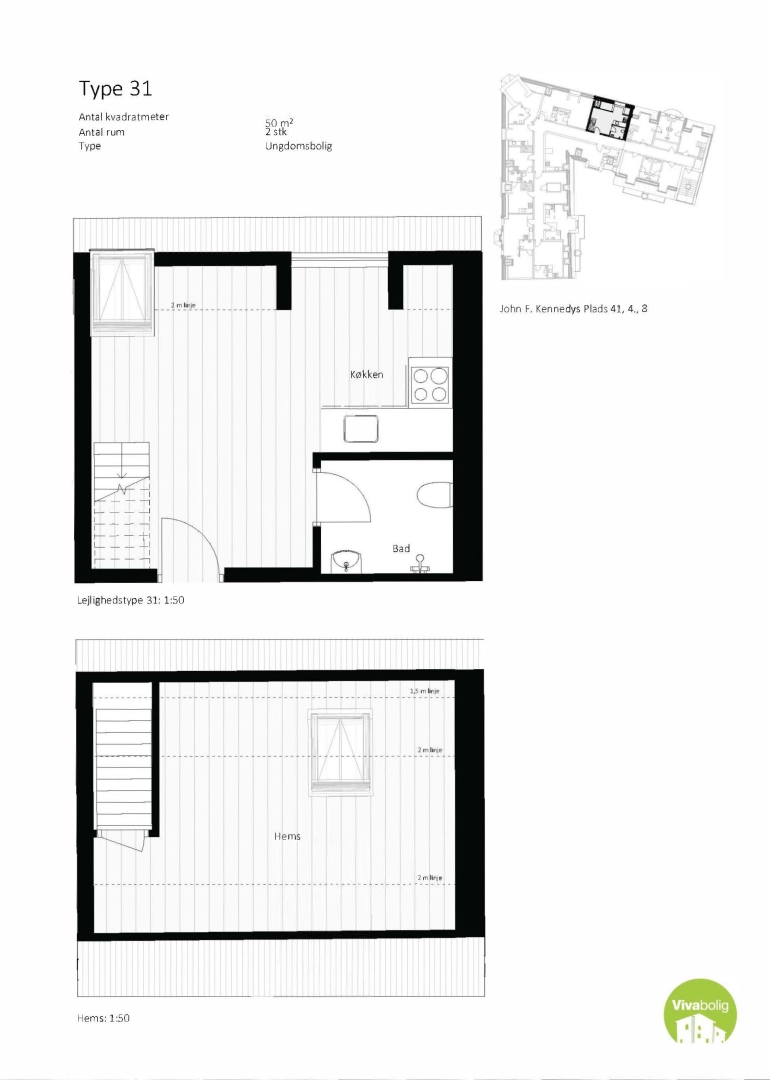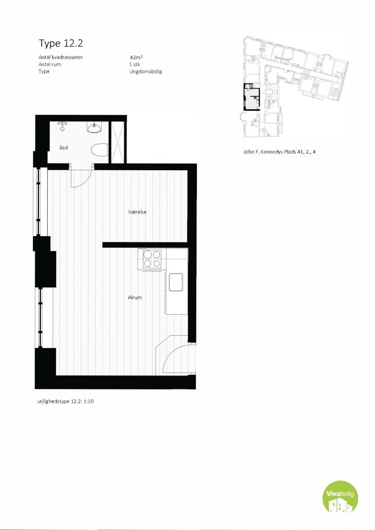 | ADRESSE: John F. Kennedys Plads 41, 4. 8 | RUM: 2 | M2: 50 | INDSKUD: 24.587 | HUSLEJE: 4.233 | BOLIGTYPE: Etagebyggeri | LEJEMÅLSTYPE: Ungdomsboliger | FORBRUG: 450 | ELEVATOR: ja | HUSDYR: nej | |