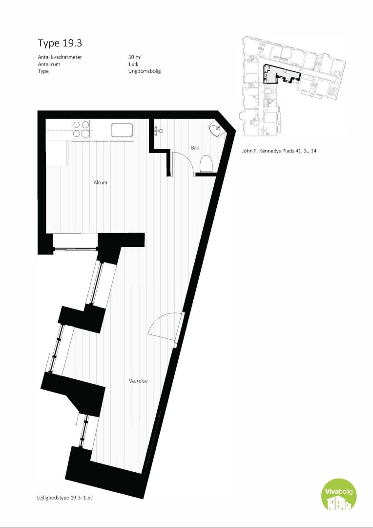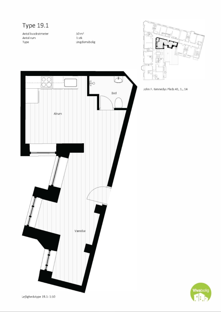 | ADRESSE: John F. Kennedys Plads 41, 3. 14 | RUM: 1 | M2: 50 | INDSKUD: 24.588 | HUSLEJE: 3.511 | BOLIGTYPE: Etagebyggeri | LEJEMÅLSTYPE: Ungdomsboliger | FORBRUG: 960 | ELEVATOR: ja | HUSDYR: nej | |