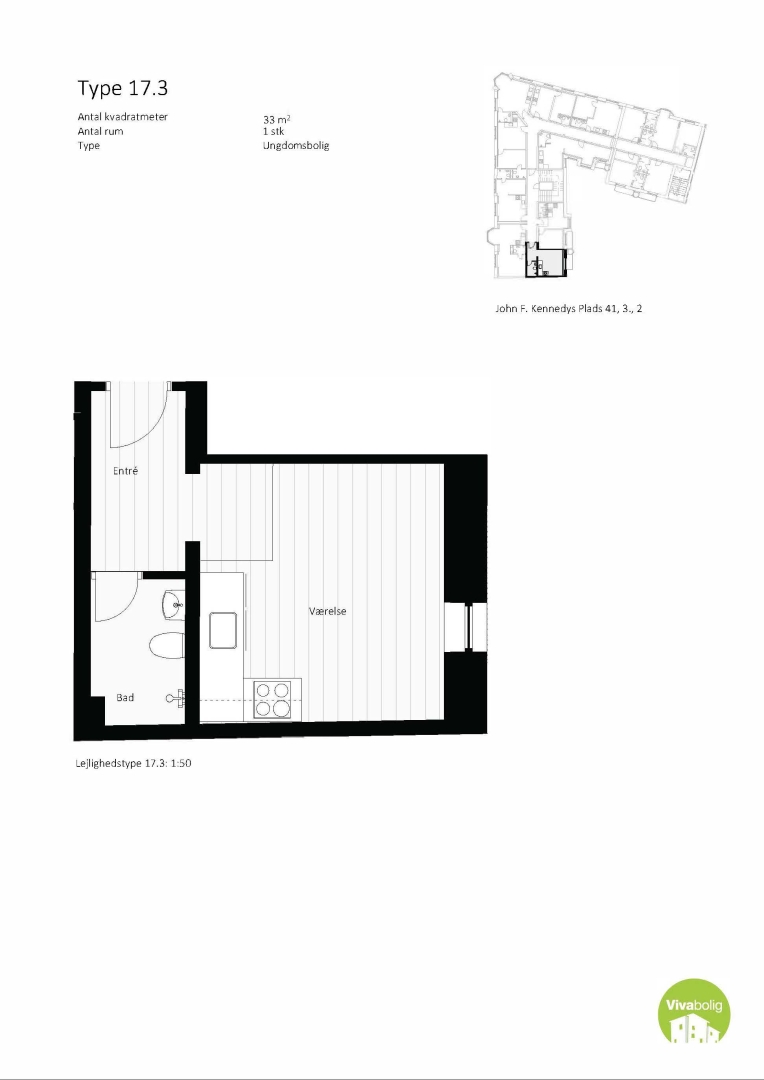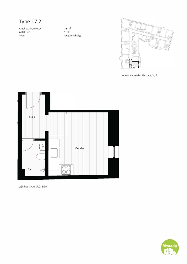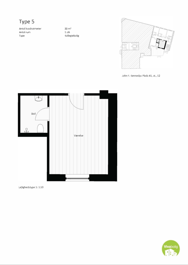| ADRESSE: John F. Kennedys Plads 41, 2. 13 | RUM: 1 | M2: 33 | INDSKUD: 4.950 | HUSLEJE: 1.704 | BOLIGTYPE: Etagebyggeri | LEJEMÅLSTYPE: Kollegieværelse | FORBRUG: 450 | ELEVATOR: ja | HUSDYR: nej | |