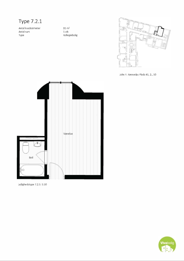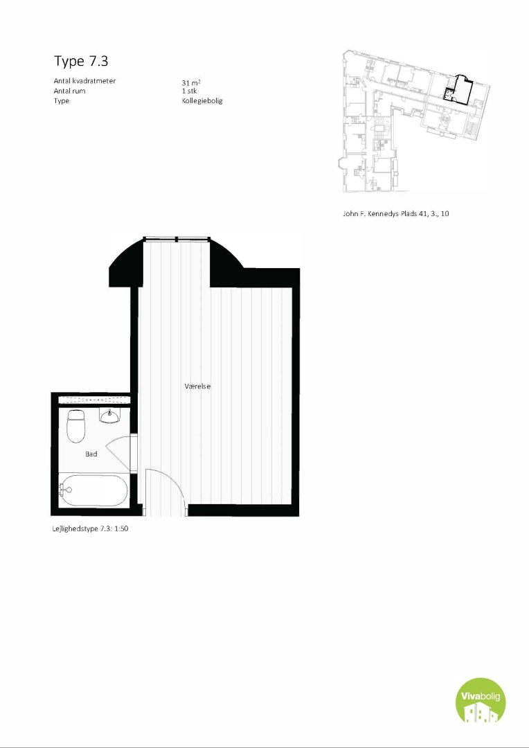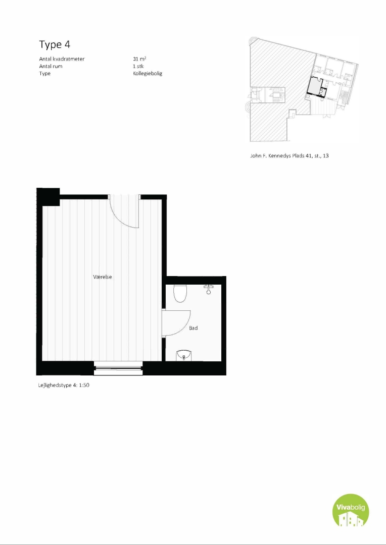 | ADRESSE: John F. Kennedys Plads 41, 3. 10 | RUM: 1 | M2: 31 | INDSKUD: 5.700 | HUSLEJE: 1.962 | BOLIGTYPE: Etagebyggeri | LEJEMÅLSTYPE: Kollegieværelse | FORBRUG: 450 | ELEVATOR: ja | HUSDYR: nej | |