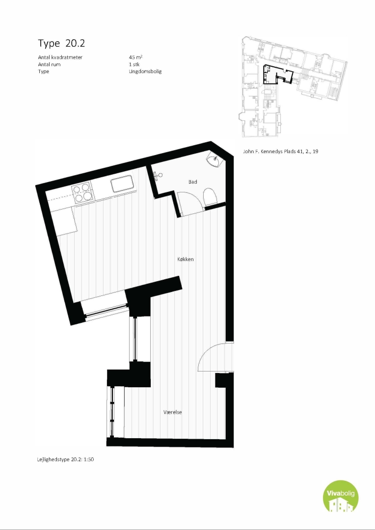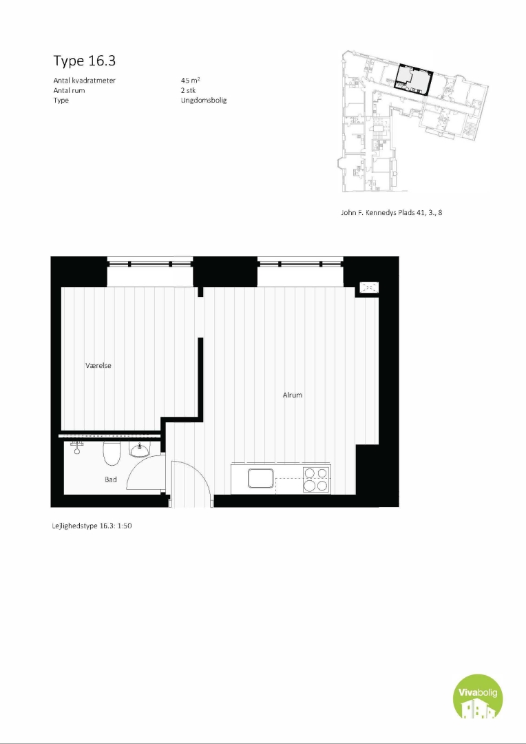 | ADRESSE: John F. Kennedys Plads 41, 2. 19 | RUM: 1 | M2: 45 | INDSKUD: 22.129 | HUSLEJE: 3.511 | BOLIGTYPE: Etagebyggeri | LEJEMÅLSTYPE: Ungdomsboliger | FORBRUG: 450 | ELEVATOR: ja | HUSDYR: nej | |
