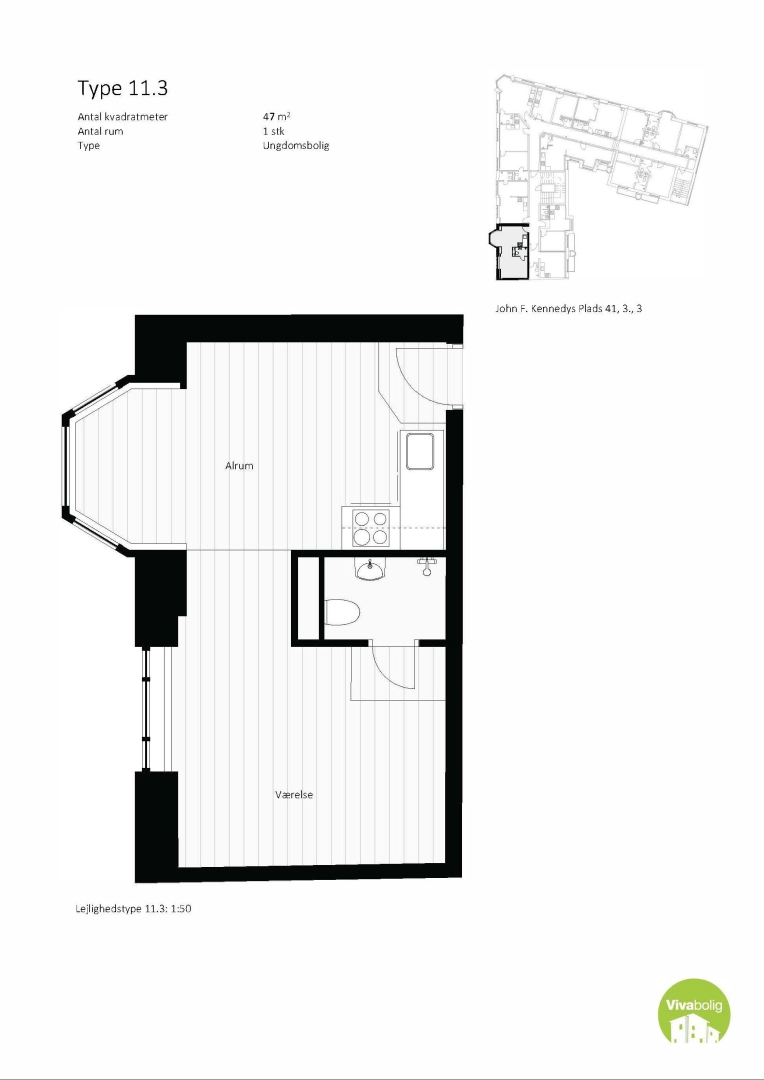 | ADRESSE: John F. Kennedys Plads 41, 1. 3 | RUM: 1 | M2: 47 | INDSKUD: 23.112 | HUSLEJE: 4.440 | BOLIGTYPE: Etagebyggeri | LEJEMÅLSTYPE: Ungdomsboliger | FORBRUG: 480 | ELEVATOR: ja | HUSDYR: nej | |