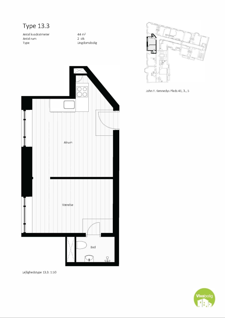 | ADRESSE: John F. Kennedys Plads 41, 3. 5 | RUM: 2 | M2: 44 | INDSKUD: 21.637 | HUSLEJE: 4.130 | BOLIGTYPE: Etagebyggeri | LEJEMÅLSTYPE: Ungdomsboliger | FORBRUG: 530 | ELEVATOR: ja | HUSDYR: nej | |