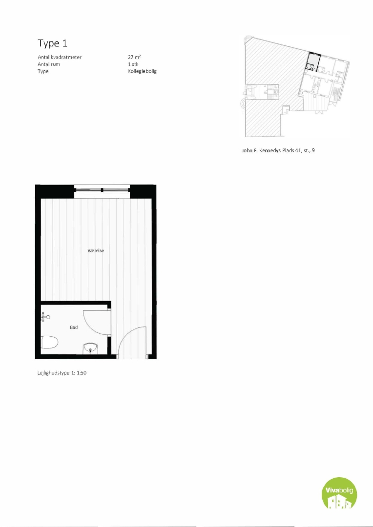 | ADRESSE: John F. Kennedys Plads 41, st. 9 | RUM: 1 | M2: 27 | INDSKUD: 5.100 | HUSLEJE: 1.756 | BOLIGTYPE: Etagebyggeri | LEJEMÅLSTYPE: Kollegieværelse | FORBRUG: 580 | ELEVATOR: nej | HUSDYR: nej | |