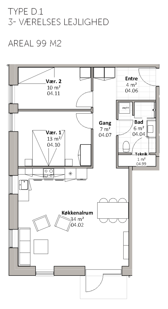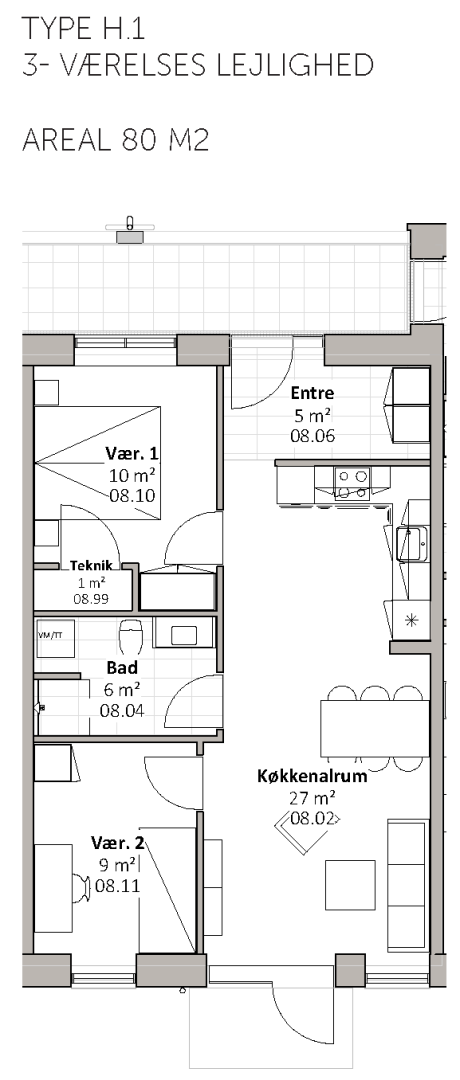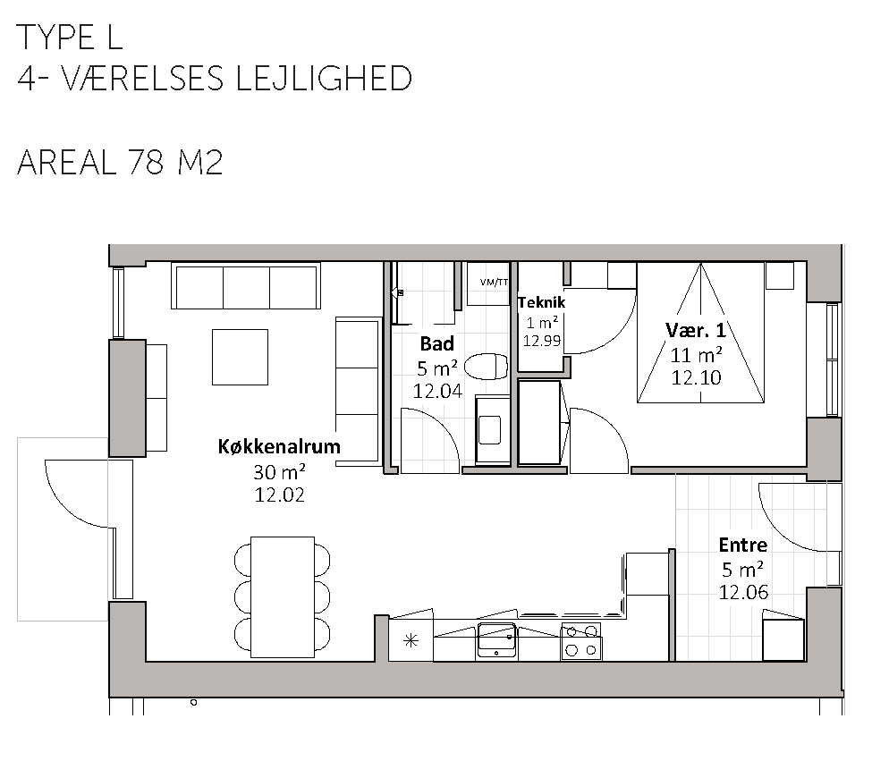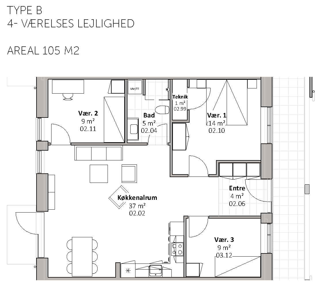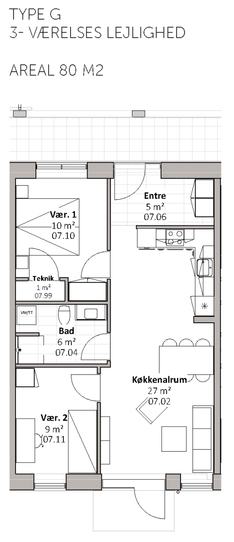De 17 almene familieboliger varierer i størrelse fra 67 til 112 m2 og placeres på 1. og 2. sal. Boligerne er 2-, 3- og 4-rums boliger. Boligernes målgruppe er bred, da boligerne er egnet for både unge og ældre, børnefamilier mv. Byggeriet indeholder elevator. Udenfor skabes der naturlige samlingssteder, herunder et hyggeligt gårdrum med grønne og rekreative områder.