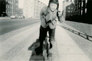 I kældrene lavede vi spøgelsestog med græskarhoveder og legevogne. Her så vi også tegnefilm fra en skærm udskåret i en skotøjsæske og med bagbelysning fra datidens cykellygter, en såkaldt ”NEFA-blænder”, og filmstrimlen var lavet af pergamentpapir. Vi høstede celluloid fra cykelstyr, som brændte under så fin en røg når det blev ramt af solens stråler gennem en lup kaldet et ”brændeglas”, jeg erindrer stadig duften. Jeg er ikke gået glip af mange oplevelser i kælderen, dog skete det en gang til min store fortrydelse. Jeg kom hjem fra tre ugers sommerferie efter en rejse på skolefribilletter med toget til København. I parentes skal jeg lige nævne, at jeg i Brønshøj nød godt af de lokale bissers respekt for Aalborg som bokse by.” Hvor fanden kommer du fra, bonderøv? - jeg er fra Aalborg - nå – nå ”. Men jeg kom så altså hjem og hørte at vores kælder ugen forinden havde været så meget oversvømmet, så man havde sejlet rundt dernede i sine zinkbadekar, og det var gå’ nok´ skidetræls at komme for sent hjem til.